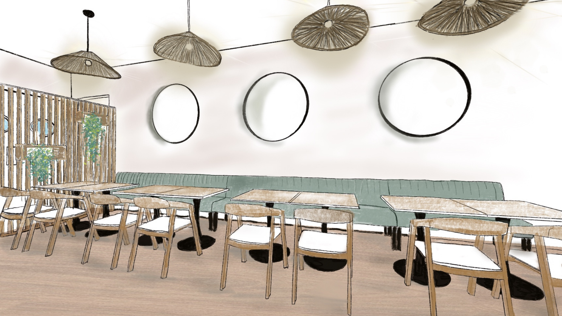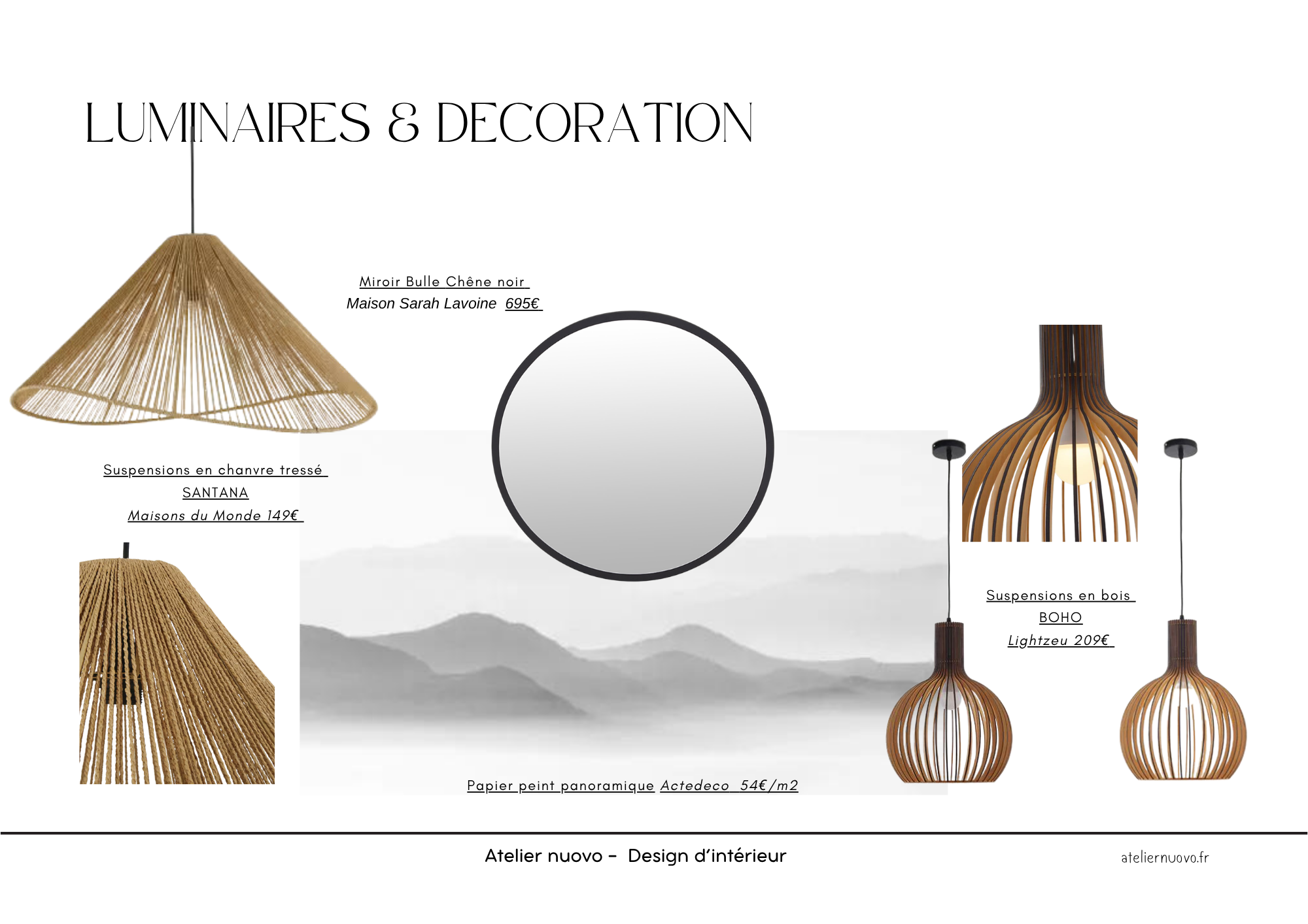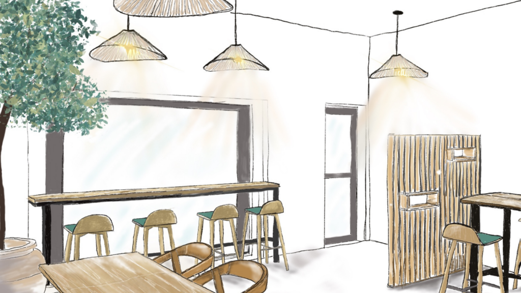 L’aménagement se divise en plusieurs espaces conviviaux, avec notamment une zone bar structurée par de hautes tables au plateau en chêne massif et une structure suspendue végétalisée. L’éclairage joue un rôle clé dans l’ambiance, avec de grandes suspensions en chanvre ou en bois ajouré qui diffusent une lumière douce. Enfin, l’ajout d’un papier peint panoramique paysager et de grands miroirs ronds vient agrandir visuellement l’espace tout en soulignant l’esprit zen et raffiné du lieu.