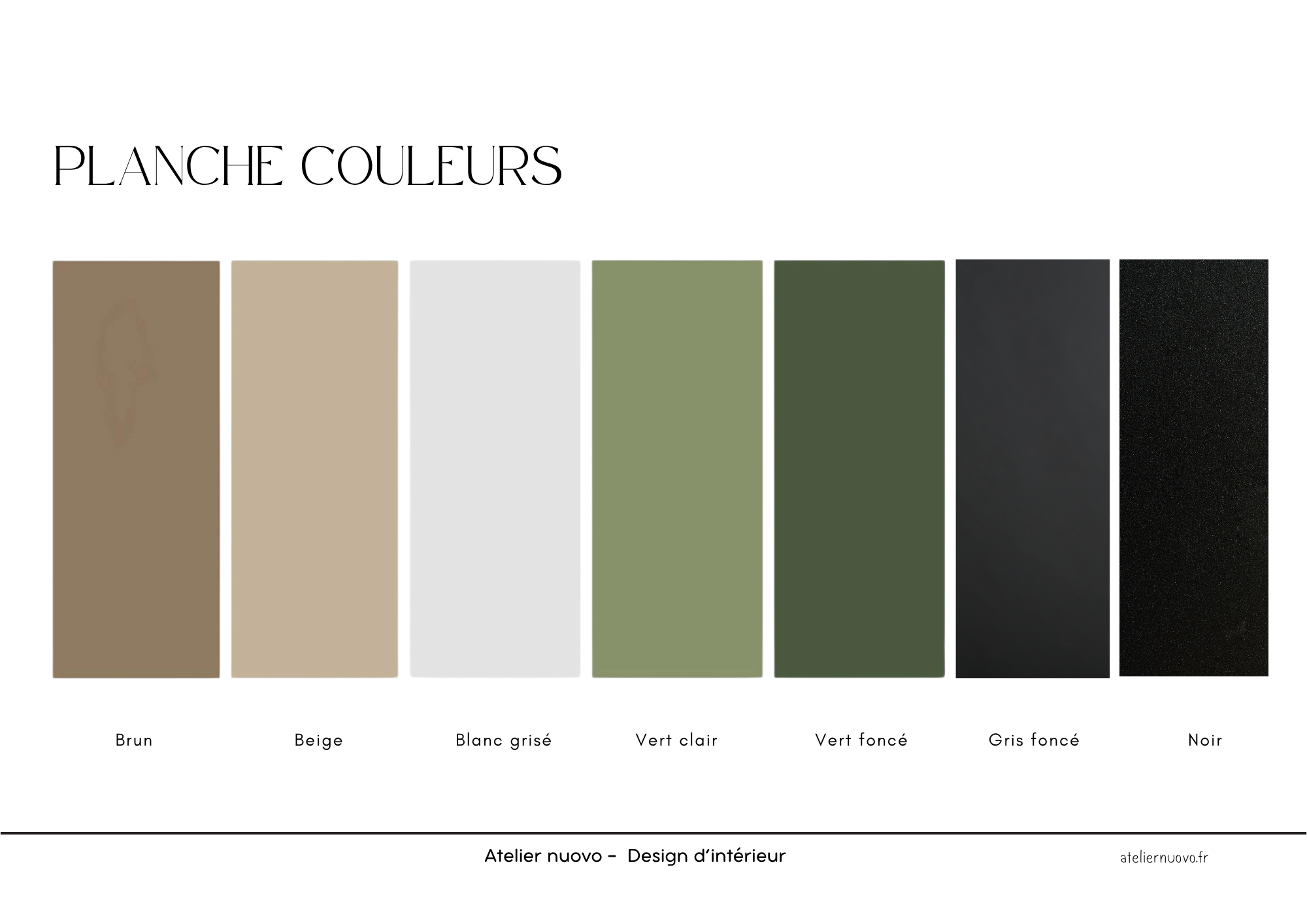 L’identité visuelle du restaurant s’articule autour d’une palette de couleurs organiques, mêlant des tons bruns, beiges, et différentes nuances de vert (clair et foncé), contrastés par des touches de gris et de noir. Côté matériaux, nous avons privilégié des textures chaleureuses et authentiques : un plancher en chêne, des assises en velours vert profond ou en cuir, et des détails texturés en chanvre tressé, céramique et tasseaux de bois.